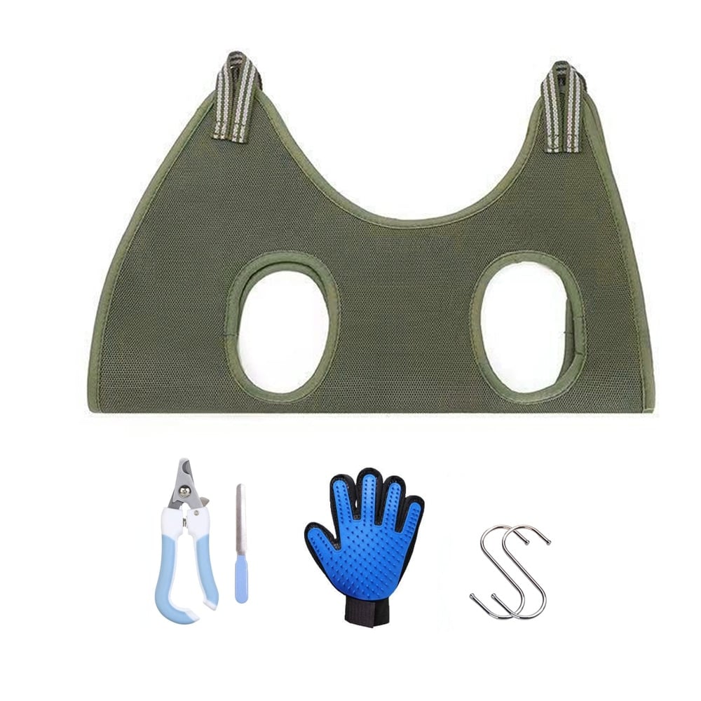 This cat beauty hammock comes with cat nail clippers, a rubbing knife, two hooks, and a de-shedding brush glove.